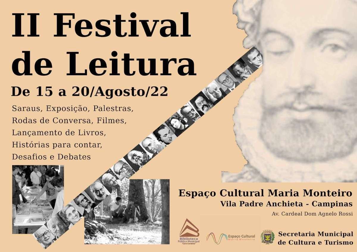 O II Festival de Leitura, agendado para o Espaço Cultural Maria Monteiro, na Vila Padre Anchieta, começa nesta segunda-feira, 15 de agosto, e termina no sábado, 20 de agosto. O evento é gratuito e conta com o apoio da Secretaria Municipal de Cultura e Turismo de Campinas.