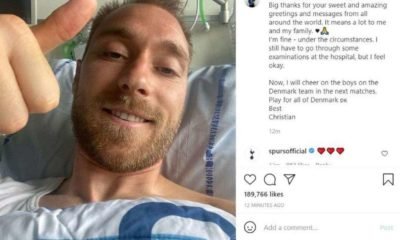 O jogador dinamarquês Christian Eriksen disse que está se sentindo “bem, dadas as circunstâncias” e expressou gratidão pela avalanche de mensagens que recebeu depois que sofreu...