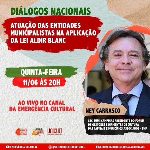 O secretário de Cultura de Campinas, Ney Carrasco, participará de uma transmissão online ao vivo sobre o tema “Diálogos Nacionais – Atuação das entidades municipalistas na...