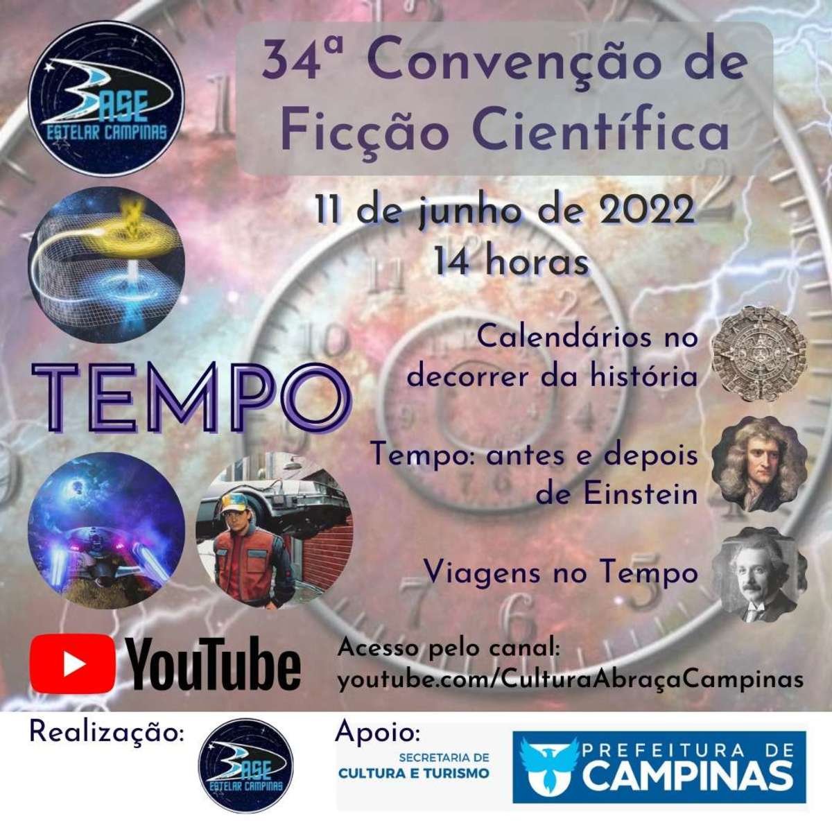 O evento é aberto ao público em geral e tem como tema “Tempo, suas facetas e seus enigmas” e o debate sobre a possibilidade de viagens no tempo e suas consequências. A convenção começa às 14h, e poderá ser acompanhada em youtube.com/CulturaAbraçaCampinas