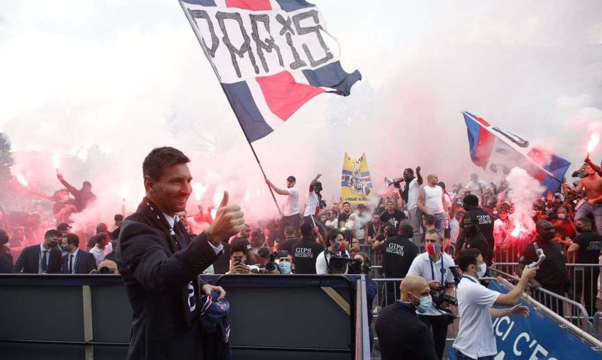 Milhares de torcedores empolgados se reuniram diante do estádio parisiense Parc des Princes batendo tambores, acenando com bandeiras e gritando o nome de Messi.