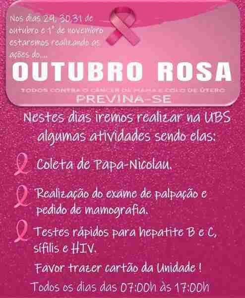 A Secretaria Municipal de Saúde, realiza nos dias 29, 30, 31 de outubro e 1º de novembro, um evento de conscientização e prevenção do câncer de...